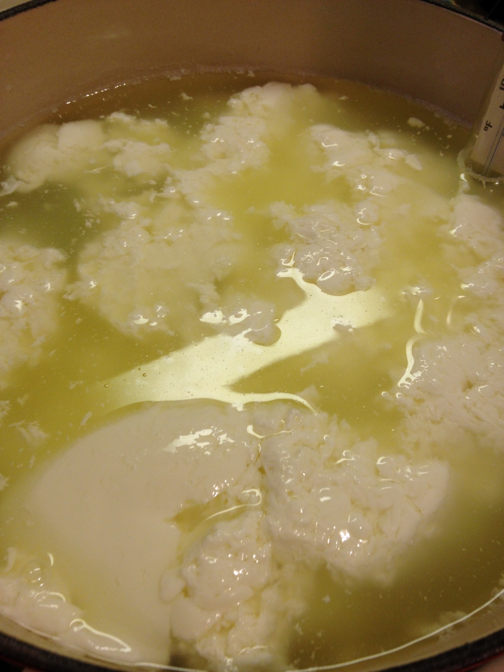 I downloaded instructions on how to make the cheese from different sources on the web. I read them all and one in particular had step by step instructions, so I followed that. Unfortunately while was in the middle of making the cheese, I screwed up one step. I took the curds and dumped them in cold water, which I wasn’t supposed to do until I kneaded it. When I started kneading it was wasn’t pliable or stretchy like it was supposed to be. I get the feeling that the cold water must have done something to it.